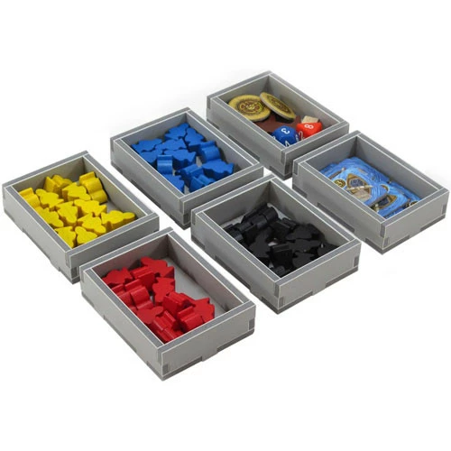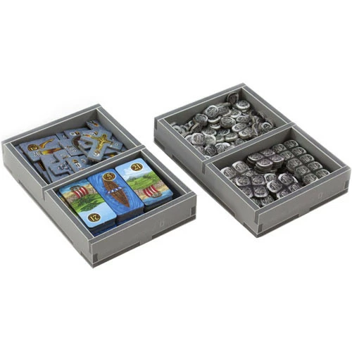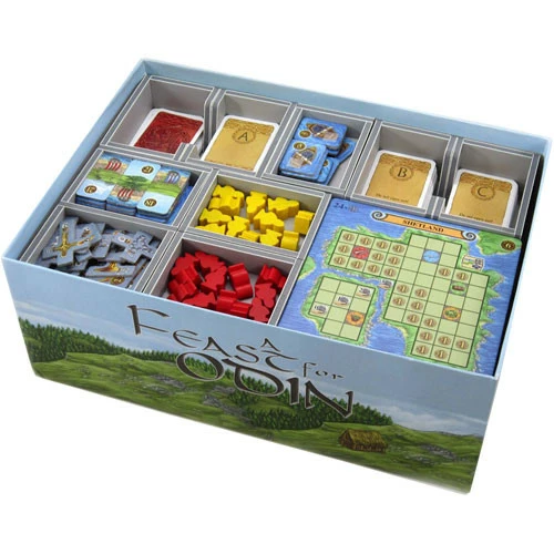 Insert compatible with A Feast for Odin , and the Mini Expansion #1. The design provides both efficient storage and improved game play. Many of the trays can be utilised during the game, and they greatly aid set-up and clear-away times. There is space for all cards to be sleeved.