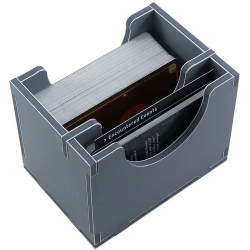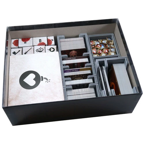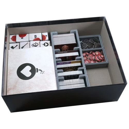 Insert compatible with Gloomhaven: Jaws of the Lion. The design provides both efficient storage and improved game play. Many of the trays can be utilised during the game, and they greatly aid set-up and clear-away times. The insert is arranged in three layers.