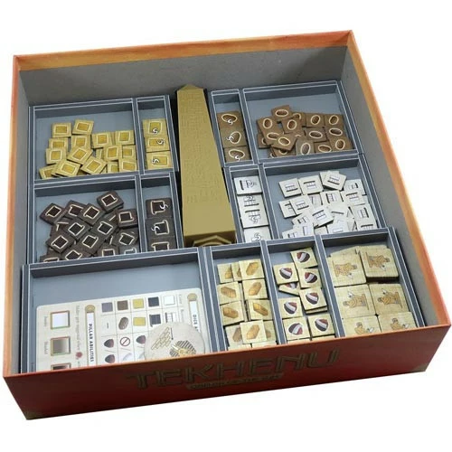 Insert compatible with Tekhenu: Obelisk of the Sun. The design provides both efficient storage and improved game play. Many of the trays can be utilised during the game, and they greatly aid set-up and clear-away times. The insert is arranged in up to three layers.