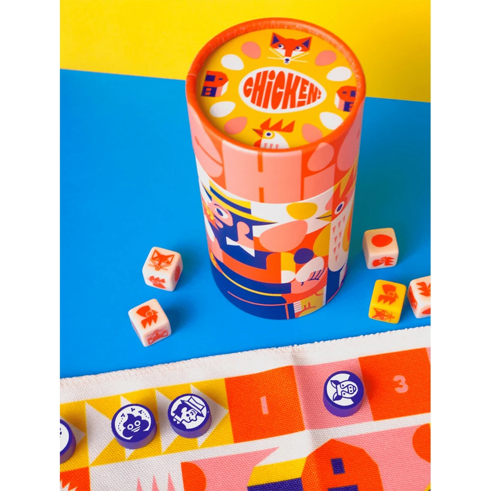 Pop open the tube and start chucking dice with family and friends! In Chicken!, players will be rolling dice each turn – pressing their luck to score more Chickens while avoiding those foxes.