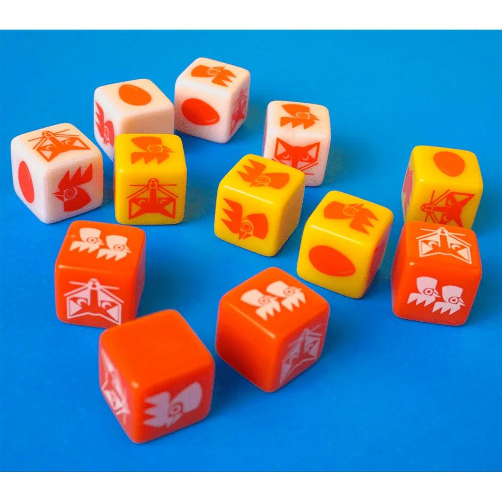 For each Egg symbol rolled, a die is hatched from the Coop and then the active player will choose to reroll all of their blanks, eggs, and newly hatched dice, or they may score their points and pass the dice to the next player. If a player chooses to “Chicken Out” at the start of their turn, they lose a point for being a chicken, but they get to place all Yellow and Orange dice back into the Coop.