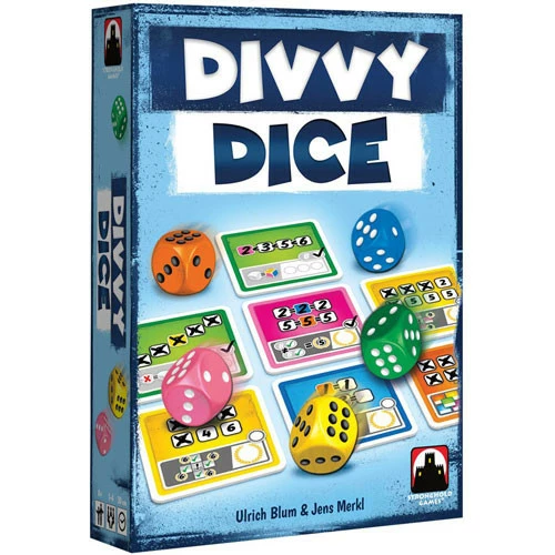 Divvy Dice is an engaging game of luck and strategy. Players purchase cards as they go, and use the dice to earn bonuses and points off those cards. Everyone plays at the same time, because when the active player rolls the dice again, everyone else gets to use a die – so players must be careful how much they reroll.