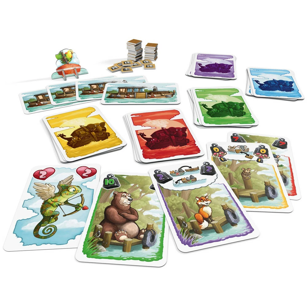 You draw three animal cards per round. You play these into boats: twice face up and one time face down. Each boat holds only three animals, though. After all of them have boarded, some animals can cause others to switch boats. Any boat with passengers that, in total, are too heavy for it will sink. Animals aboard boats that don’t sink are worth VPs. If you have the most VPs after four rounds, you win.