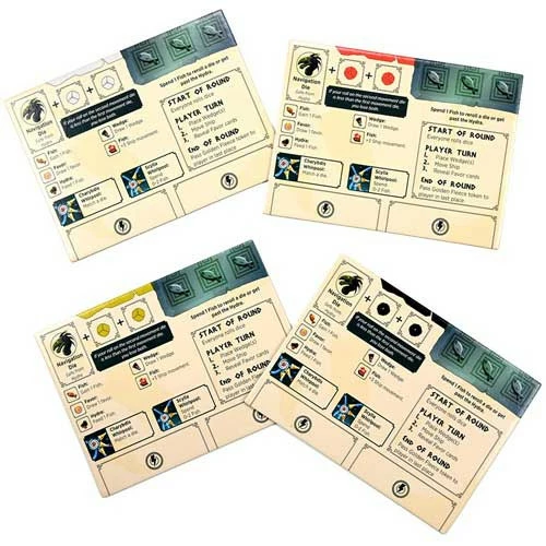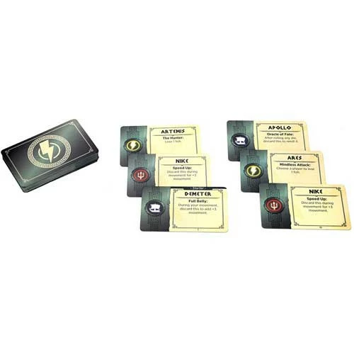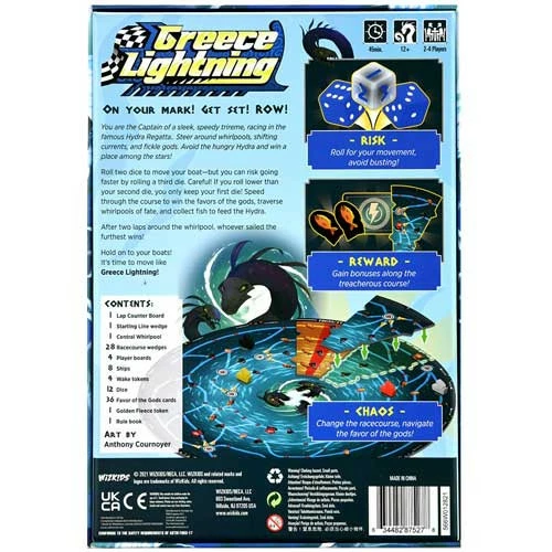 Roll two dice to move – but you can risk going fast by rolling a third die. Careful! If you roll lower than your second die, you only keep your first die! Speed through the course to win the favors of the gods, traverse whirlpools of fate, and collect fish to feed the Hydra.