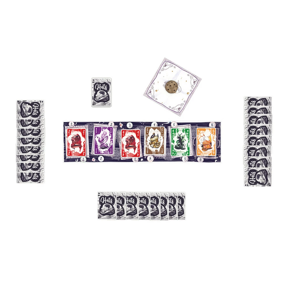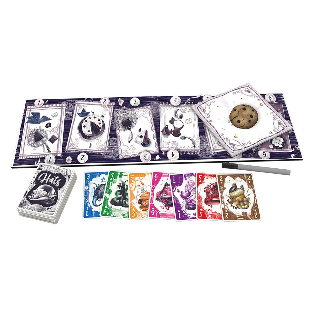 You have an invitation at 5pm at the Mad Hatter’s garden. Players will compete to collect the most outstanding hats in a spicy set collection game where players will dictate how each hat is scored. Who will get the last cookie?