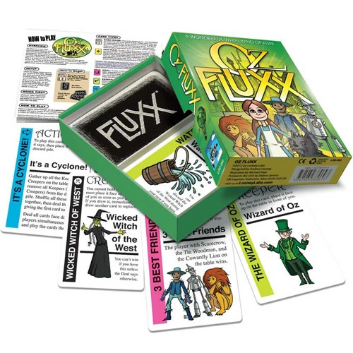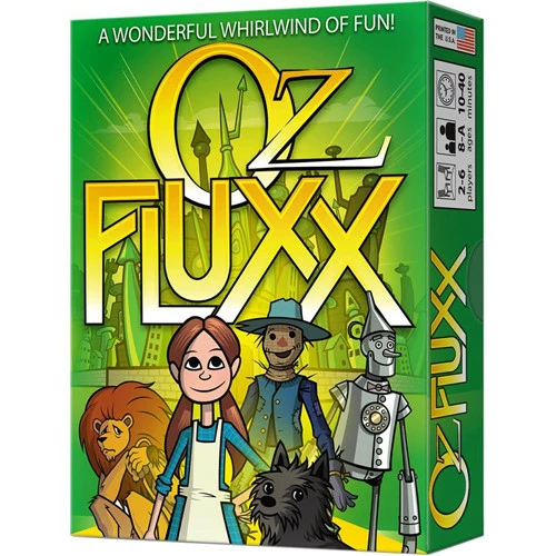 Does life seem drab and humdrum? Let the cyclone of Fluxx, the ever-changing card game, whisk you away to a magical world of fun and wonder! Mingle with Munchkins, make new friends, help them with their quests, and follow the Yellow Brick Road to seek the Wizard’s help for your own heart’s desire – but beware the flying monkeys, fighting trees, and fields of poppies! Don your green spectacles to enter the Emerald City, and keep a bucket of water handy: you never know when you’ll run into a Wicked Witch that needs melting. Next stop… the land of Oz!
