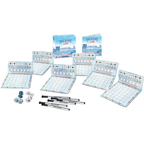 Railroad Ink is a competitive puzzle game for the whole family. Roll the dice and draw Routes on your board. Create transportation networks to connect Exits and score points at the end of the game. Play with one of the two included expansions (Rivers and Lakes) for a more challenging experience!
